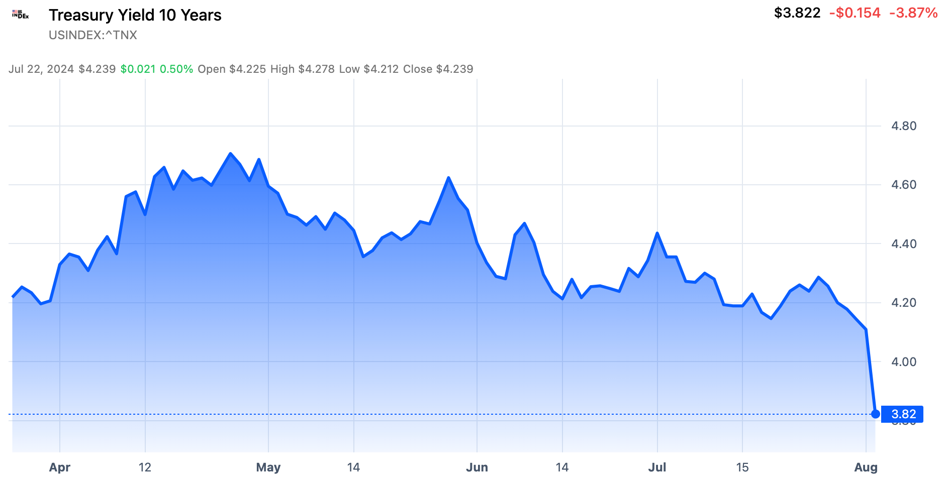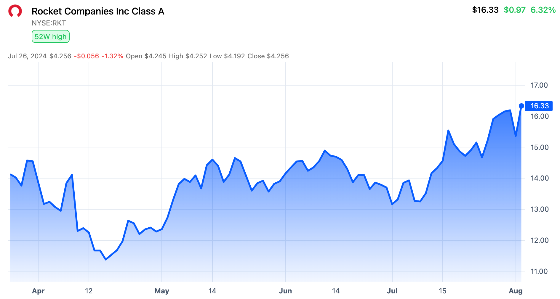 Rocket Mortgage (NYSE: RKT), has hit a 52-week high and is currently trading at $16.28 on August 2, 2024. The 10-year Treasury yield has decreased to 3.82%, indicating a positive change in mortgage rates. Markets are pricing in lower rates, which should be positive for Rocket Mortgage's business.